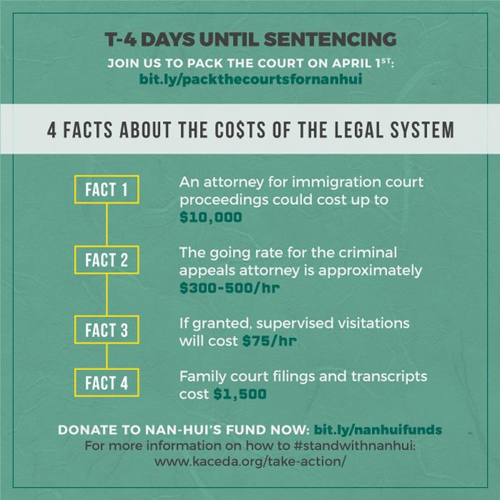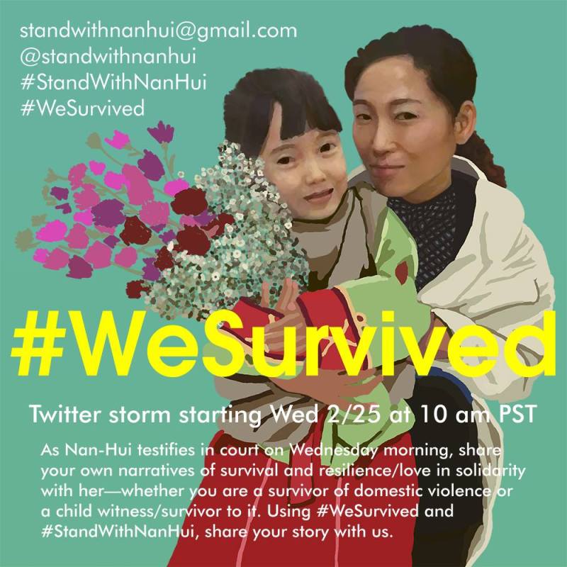 Nan-Hui Jo is a loving single mother, undocumented Korean, and survivor of domestic violence. In July 2014, she was arrested and charged with “child abduction” for fleeing the country in order to protect herself and her daughter from an abusive relationship. Upon her arrest, her former partner was given full custody of her daughter in spite of previous domestic violence. Nan-Hui has gone eight months without any contact with her daughter, and has not been allowed bail. She was found guilty in her second trial, and is awaiting her sentencing on April 28th. Nan-Hui now faces felony charges, indefinite detention (in jail or in an immigration detention center) and/or deportation which could result in permanent separation from her daughter.